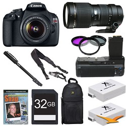 Wildlife Photographer Bundle includes EOS Digital Rebel T5 18MP SLR Digital Camera EF-S 18-55mm f/3.5-5.6 IS II Lens 32GB Secure Digital SD Memory Card JumpStart Training Guide on DVD for Digital SLR Photography Neoprene SLR Strap SP AF70-200mm F/2.8 Di LD (IF) Macro For EOS 77mm UV, Polarizer FLD Deluxe Filter kit (set of 3 + carrying case) Battery Pack Pro Series Multi-Power Battery Grip 67-Inch Monopod Deluxe Digital Camera/Video Sling Style Shoulder Bag - Black EOS Performance Made Simple Perfect for families, budding photo enthusiasts and first-time SLR users alike, the EOS Rebel T5 makes it easy to capture movies and photos that are nothing short of dazzling. It features a powerful 18.0 Megapixel CMOS (APS-C) image sensor and Canon's DIGIC 4 Image Processor for easy recording of HD video and high-resolution photos and has a huge 3.0-inch LCD screen for Live View recording and review. With a 63-zone, Dual-layer metering system, an expanded ISO range for outstanding operation in less-than-perfect light, shooting modes like Scene Intelligent Auto to take the guesswork out of complex shots plus creative options like Canon's Basic+ function and Creative Auto, the EOS Rebel T5 is ready for anything. With a helpful Feature Guide, rugged, lightweight construction and proven Canon design, the EOS Rebel T5 makes EOS SLR photography faster and easier than ever! 18.0 Megapixel CMOS (APS-C) Sensor The EOS Rebel T5 has an 18.0 Megapixel CMOS (Complementary Metal Oxide Semiconductor) sensor that captures images with exceptional clarity and tonal range, and offers more than enough resolution for big enlargements or crops - your photos can be printed and framed without having to worry about quality. This first-class sensor is APS-C sized for an effective 1.6x field of view (compared to 35mm format) and features many of the same new technologies as used by professional Canon cameras to maximize each pixel's light gathering, helping to ensure images are captured beautifully and brilliantly. DIGIC 4 Image Processor The DIGIC 4 Image Processor on the EOS Rebel T5 dramatically speeds up camera operations, offering an intuitive shooting experience and providing images full of detail and natural color reproduction. It works in concert with the camera's 18.0 Megapixel CMOS sensor to achieve phenomenal levels of performance in virtually every situation, so you can shoot without having to worry about camera processes. E