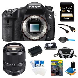 Bundle includes: Sony a77II 24.3MP HD 1080p DSLR Camera Sony SAL18135 - 18-135mm f/3.5-5.6 DT SAM Silent Zoom Lens 32GB SDHC/SDXC Class 10 UHS-1 R40 Memory Card InfoLithium H Series NP-FM500 Camera Battery Compact Deluxe Gadget Bag 57-in-1 USB 2.0 High Speed Memory Card Reader JumpStart Digital SLR Photography DVD Training Guide High Speed micro-HDMI to HDMI A/V Cable Dust Blower Digital Camera and Camcorder LCD Screen Protectors 3pc. Lens Cleaning Kit Never miss a moment with 12fps The a77II has fast continuous shooting speed- in its class - up to 12 frames per second at full resolution. Equipped with a 79 point AF sensor and advanced auto focus tracking, technology, you never have to miss a moment. The a77II outperforms even more expensive rivals with continuous auto focus and auto exposure when shooting at 12fps at full 24.3MP resolution and can capture up to 60 frames in a single burst when in JPEG fine setting World's Most AF points1- 79-point Phase Detection AF System The a77II is equipped with a newly developed phase detection auto focus system, featuring wide coverage 79 AF points. Fifteen of the AF points are cross-type and placed in the most-frequently-used central area of the sensor. This helps the a77II achieve accurate focusing even with horizontally striped subjects, which line-type AF points typically find challenging. The new AF system also performs well in low-light conditions-as low as EV -2 (ISO 100) , which is similar to a moonlit night under which objects are difficult to see even with the naked eye. The new AF algorithm instantly recognizes and reliably tracks the desired subject. The a77II also realizes impressive focusing accuracy, even when a large-aperture lens is mounted, thanks to the f/2.8 AF point placed horizontally in the center of the AF sensor overlapping another AF point. 24.3 Megapixel Stunning Resolution The a77II houses a large APS-C sensor with approx. 24.3 effective megapixels for incredible detail and gorgeous enlargements. Its high resolving power adopts the same gapless on-chip lens structure as the a7R and features the latest-generation RGB color filter and other cutting-edge device technologies developed by Sony, the number 1 manufacturer of image sensors. The a77II's image sensor exhibits approximately 20% higher sensitivity and lower noise levels compared to the a77 throughout a wide sensitivity range of ISO 100 to 25,600. Advanced BIONZ X image processing<