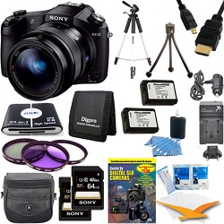 Features: Cyber-shot DSC-RX10 20.2 MP 3" LCD Digital Camera 2 64GB SDXC Class 10 UHS-1 R40 Memory Cards 2 InfoLithium H Series NP-FW50 Camera Batteries Compact Deluxe Gadget Bag for Cameras/Camcorders 62mm UV, Polarizer FLD Deluxe Filter Kit 3 Card Tri-fold Memory Card Wallet 57-in-1 USB 2.0 High Speed Memory Card Reader AC/DC Rapid Battery Charger for Sony FW50 Batteries 6 Ft. HDMI to Micro-HDMI Gold Audio/Video Cable JumpStart Digital SLR Photography Training Guide DVD 59" Full Size Photo / Video Tripod Flexible Mini Table-top Tripod 3 Pc. Digital Camera and Camcorder LCD Screen Protectors 3pc. Lens Cleaning Kit See life in a new light Open your eyes. A bright, large-aperture zoom lens, a big, extra-sensitive image sensor and other brilliant features are ready to fire up your passion to create. With the new RX10 the compact digital camera that puts boundless picture-taking power in your hands and a fresh new outlook in your sights More room to zoom at will Close-up shooting is seamless. No switching to macro mode is needed. Zoom in all the way up to extreme telephoto on a subject as near as 30cm away. The built-in lens makes it more convenient for you to take impressive shots throughout a big range. More capability now more compact An advanced aspherical lens (AA lens) reduces diameter and length, and maintains high resolution even at image edges. A new Direct Drive SSM (Super Sonic wave Motor) stops lens movement with spot-on precision. Far-reaching optical flexibility minimizes mechanical dimensions. Precise alignment of the image sensor and lens also perfectly combines diminutive form and outsized performance.